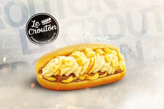 Beignet fourré au Nutella, crème pâtissière, glace chocolat blanc coco mangue, banane fraîche, chantilly. Une fusion fruitée 100 % réconfort.